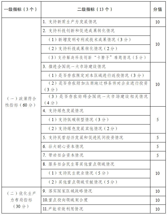 (二)评价指标体系坚持定量评价和定性分析相结合,覆盖基金运营管理全流程。指标体系包括3部分、13个具体指标:一是政策符合性指标(权重60%),主要评价基金在支持新质生产力发展、支持科技创新和促进成果转化、推进全国统一大市场建设、支持绿色发展、支持民营经济发展和促进民间投资、壮大耐心资本、带动社会资本、服务社会民生等方面发挥的作用,推动基金立足政策性定位,更好服务国家发展大局。二是优化生产力布局指标(权重30%),主要评价基金落实国家区域战略、重点投向领域契合度及产能有效利用情况等。三是政策执行能力指标(权重10%),主要评价资金效能情况及基金管理人专业水平等,推动实现政府引导、市场化运作和专业化管理的有机统一。