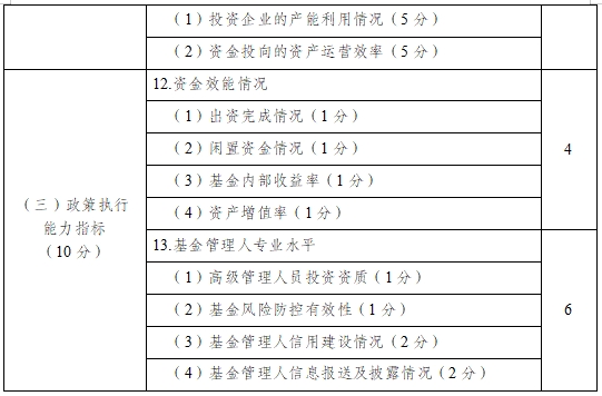(三)政策执行能力指标,主要评价资金效能情况及基金管理人专业水平等。