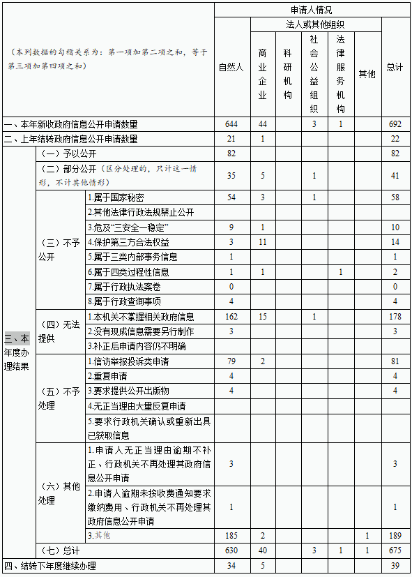 全年收到公民、法人和其他组织政府信息公开申请共714件,上年结转22件,共办结697件,均严格按照《条例》等有关规定办理。申请事项主要集中在重大基础设施、公共服务价格等方面。